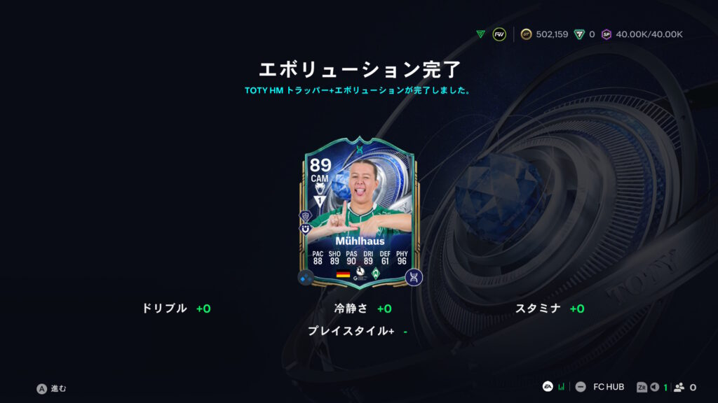 そして、一番のおすすめ。ドイツのMühlhausという選手。よく知らない選手ですが、元はウインターワイルドカードのフィジカルが鬼強化されたレート85のカード。事前準備でパスとシュートを上げておいて、自分だけのTOTYを作ろうのCAMに突っ込みました。