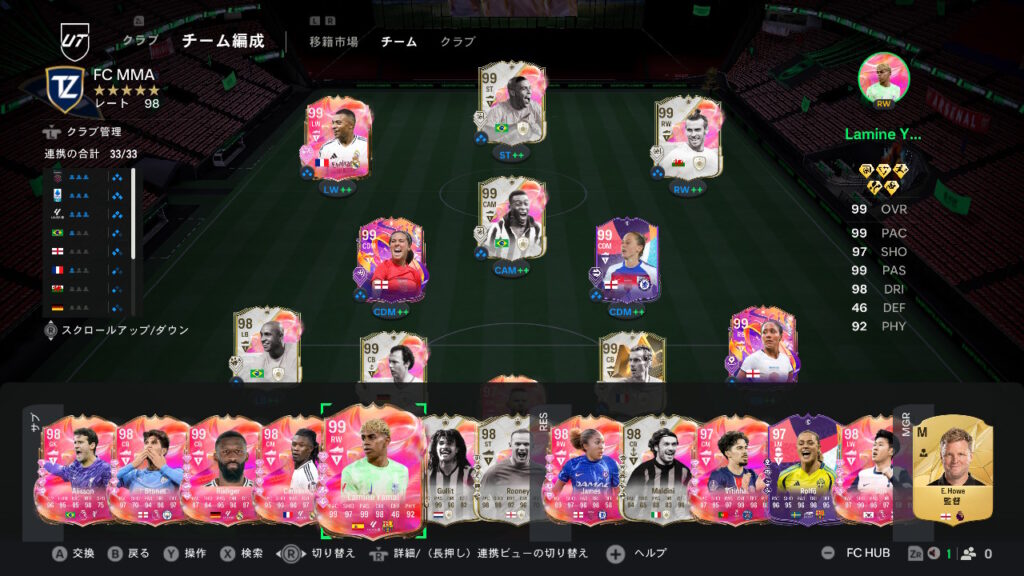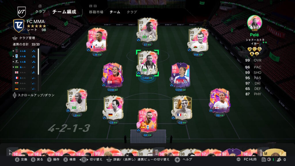 サブも豪華なスタッツ。まぁ最後のほうは、パック開ければ出るような感じでしたし、カップ戦報酬のレート99選手20人ピックとかもありましたからね。最後の最後でそろってもあんまり意味はないですが。