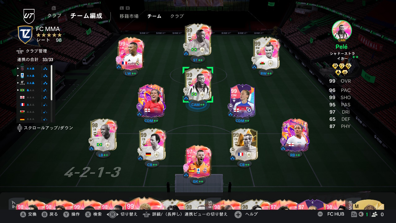 サブも豪華なスタッツ。まぁ最後のほうは、パック開ければ出るような感じでしたし、カップ戦報酬のレート99選手20人ピックとかもありましたからね。最後の最後でそろってもあんまり意味はないですが。